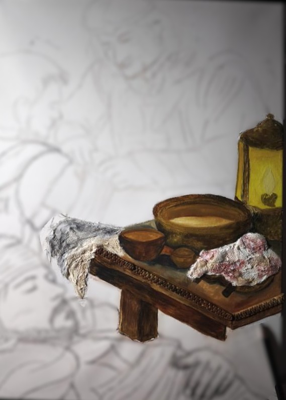 Než se štětec dotkne barvy, musí se ruka setkat s papírem. Uhel je pro mě symbolem syrovosti a pravdy. V těchto liniích hledám to, co je očím skryté - hloubku pohledu, váhu zbroje i křehkost dětské duše. Je to rozhovor se stínem, který mi napoví, zda příběh jednou ožije i pod mými prsty v hmatatelném světě či v hustém akrylu.